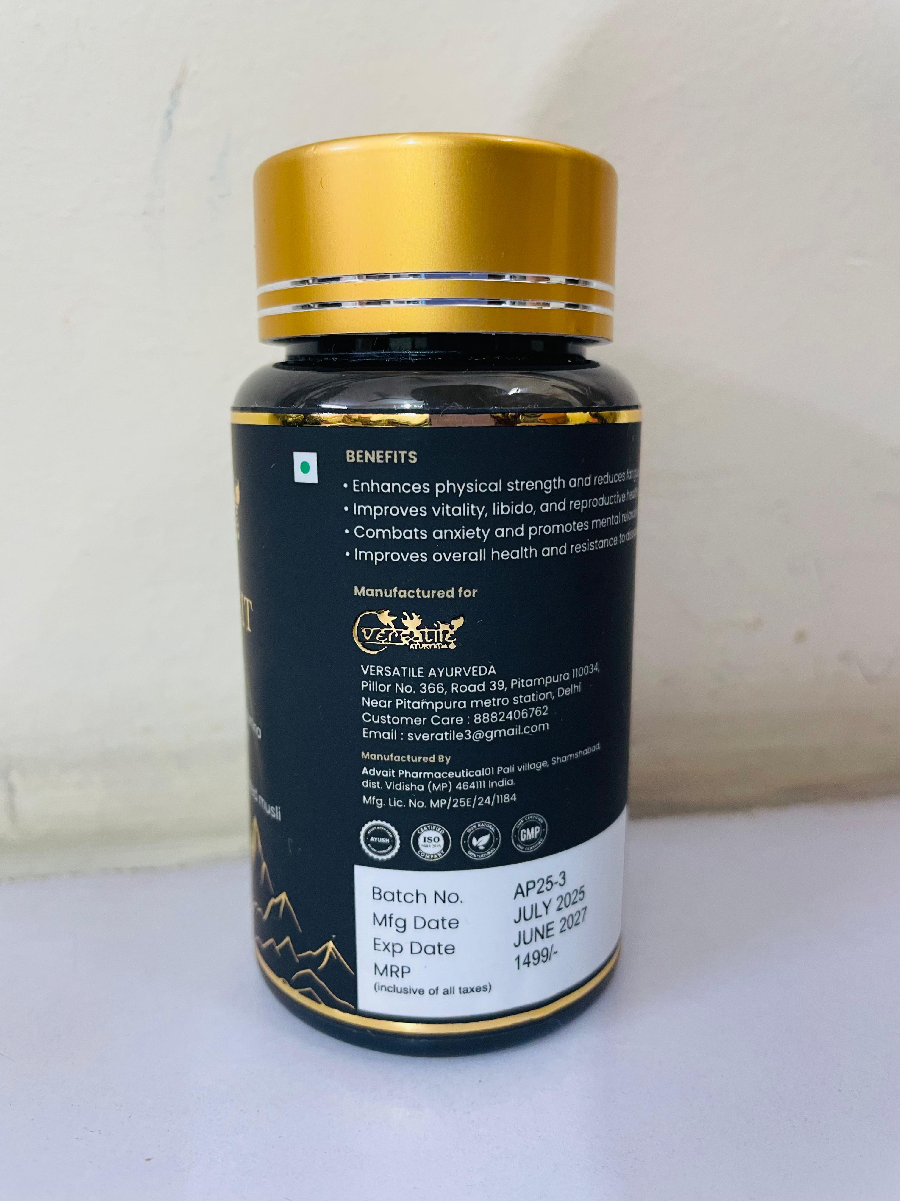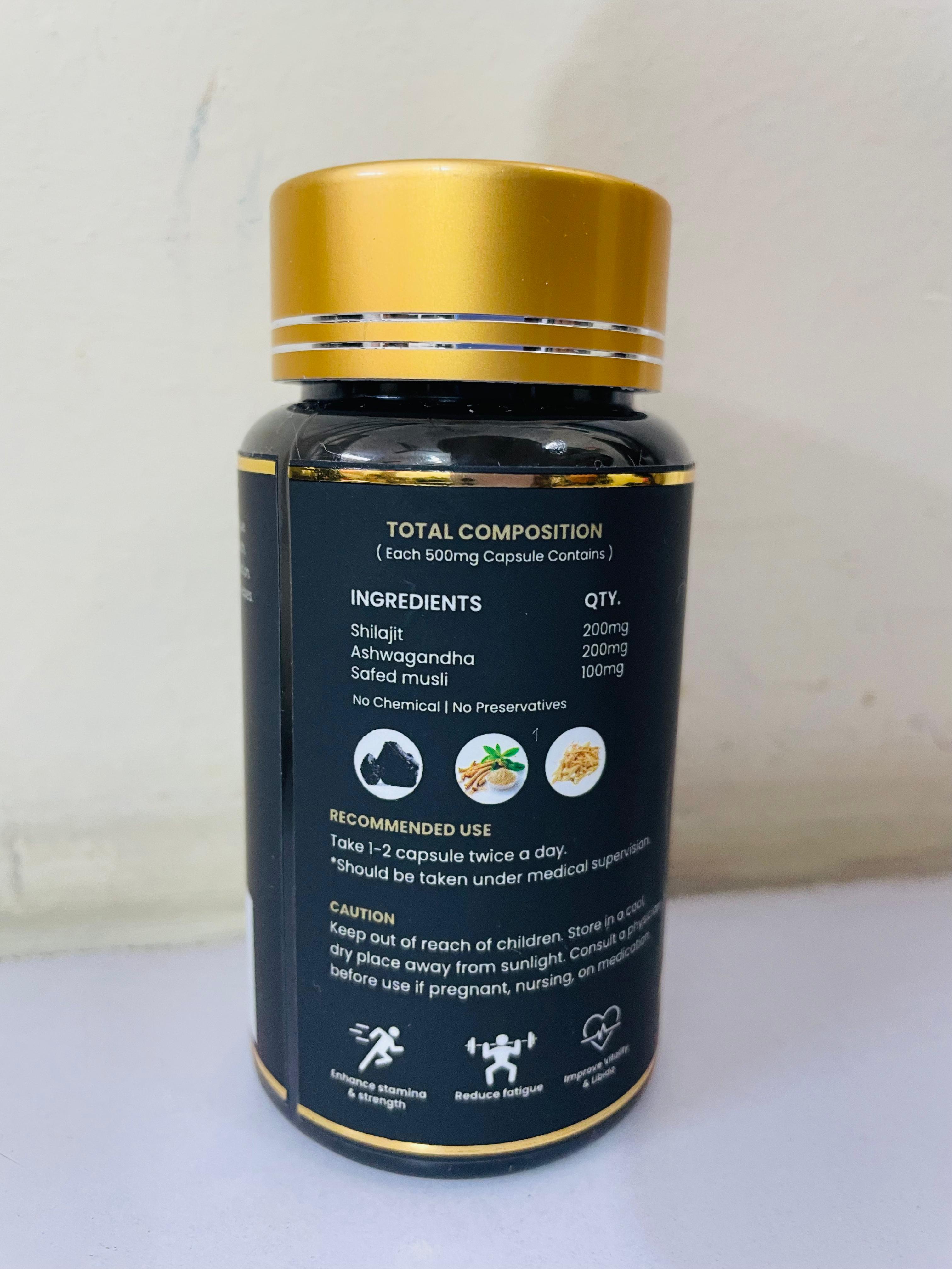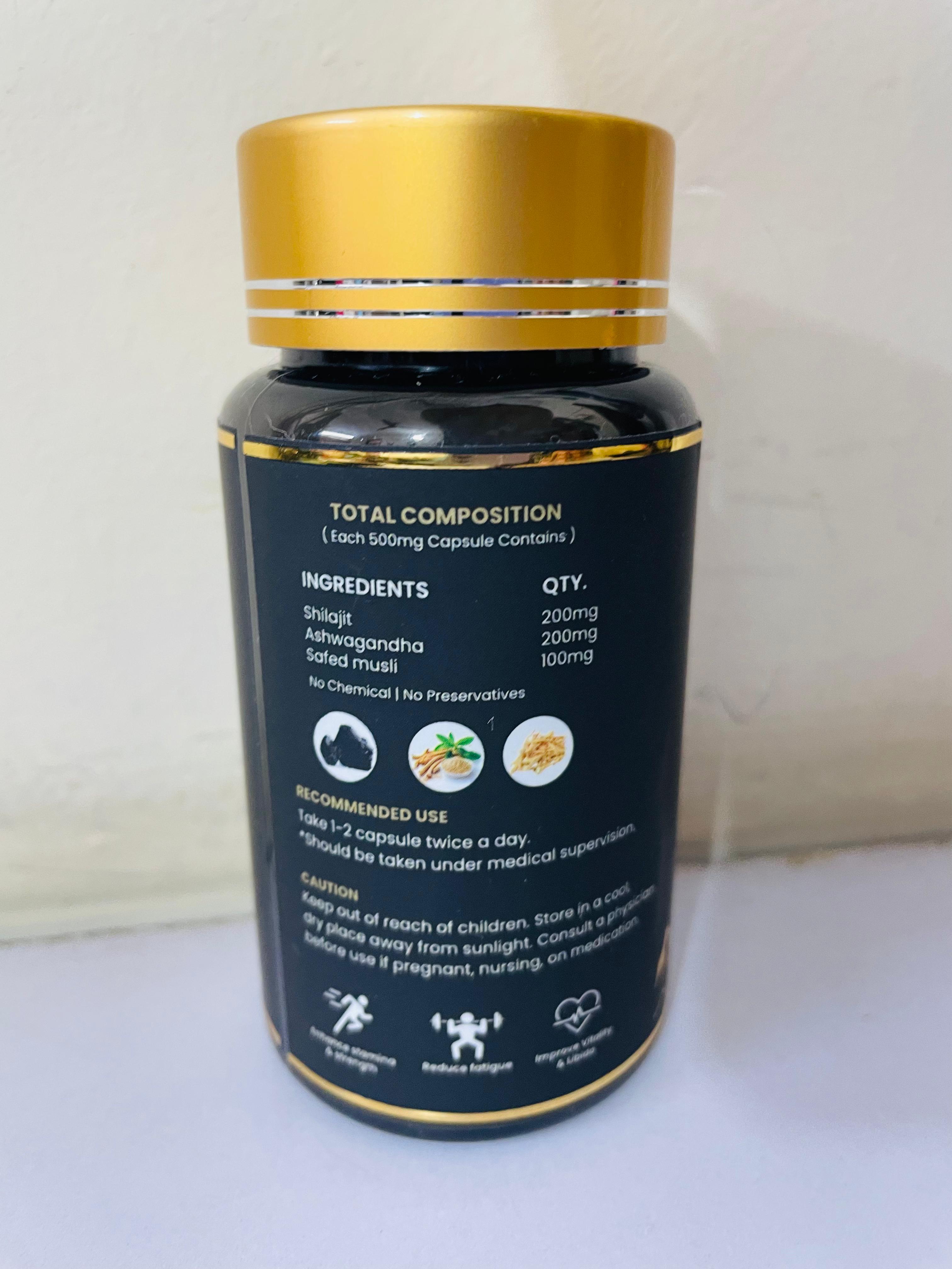Boost your stamina, strength, and vitality naturally with Shilajit Plus. Each 500mg capsule is carefully formulated with a powerful blend of Shilajit (200mg), Ashwagandha (200mg), and Safed Musli (100mg) to enhance energy levels, improve endurance, and reduce fatigue.